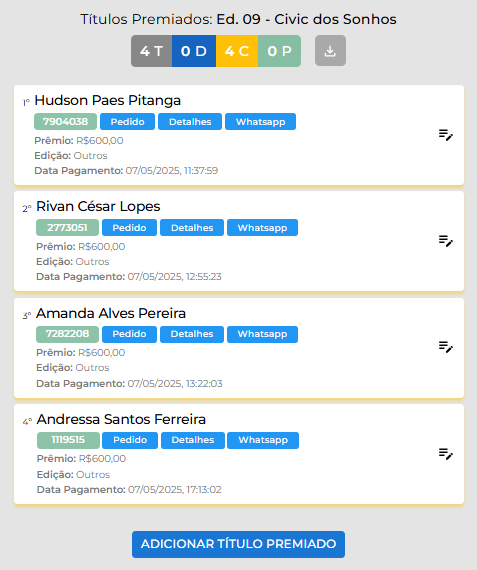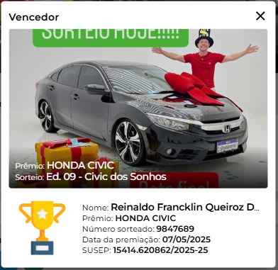 Premio Principal: HONDA CIVIC – R$96.000,00.