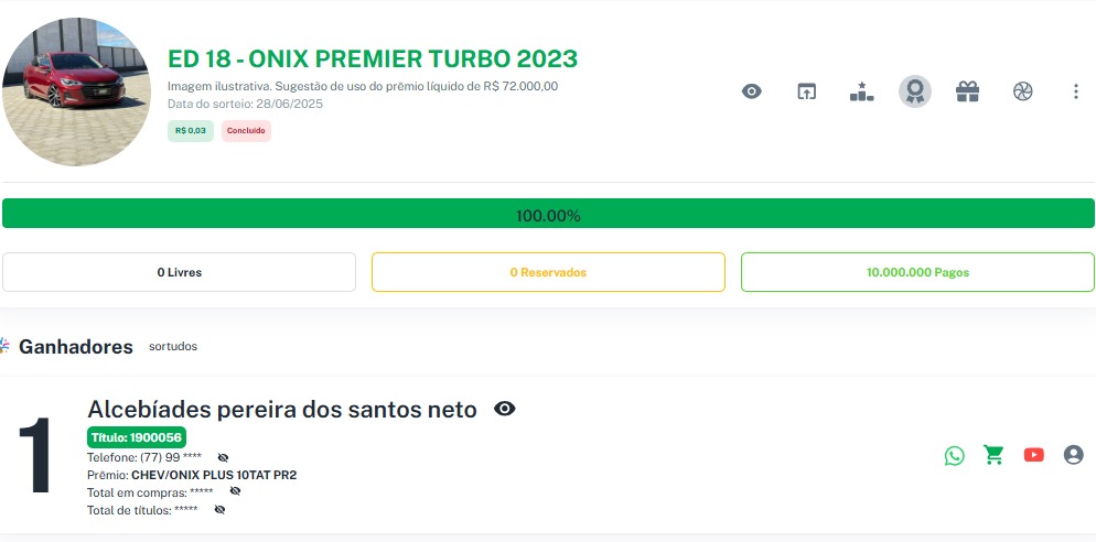 Premio Principal: CHEV/ONIX PLUS 10TAT PR2, 2023 OU 72.000,00