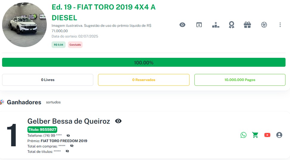Premio Principal: FIAT TORO FREEDOM 2019 OU 71.000,00