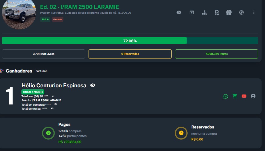 Premio Principal: I/RAM 2500 LARAMIE 2012 OU R$187.000,00