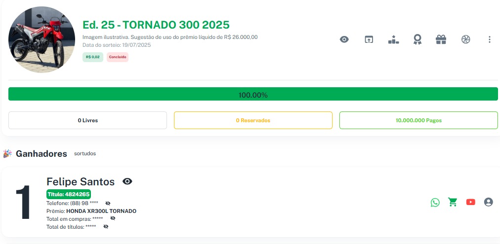 Premio Principal: HONDA XR300L TORNADO OU 26.000,00