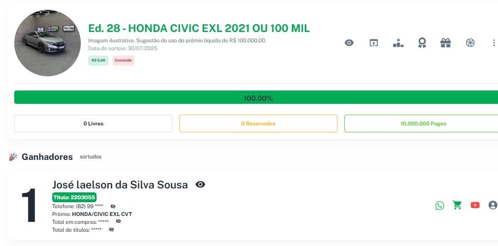 Premio Principal: HONDA/CIVIC EXL CVT 2021 OU 100.000,00