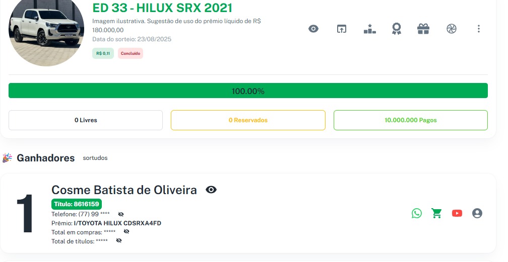Premio Principal: TOYOTA HILUX CDSRXA4FD 2021 OU 180.000,00